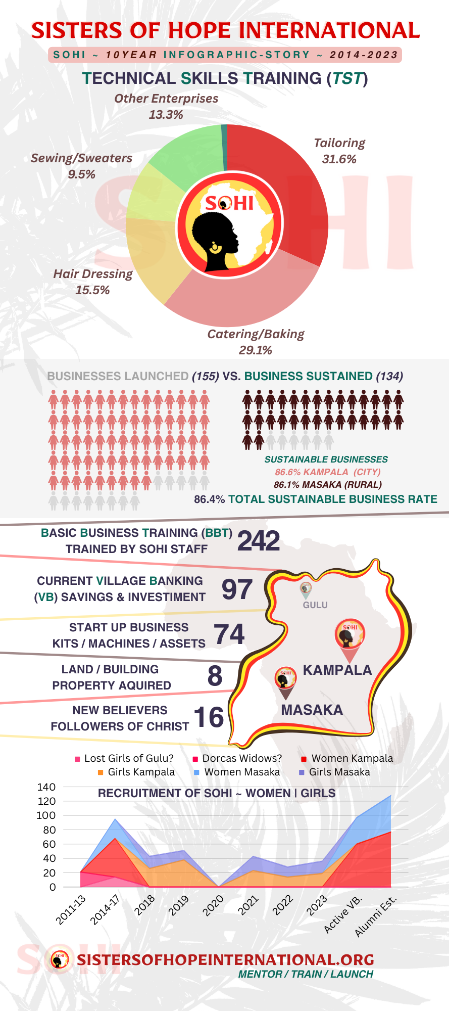 Depending on the Field of Study, after 2 years w/SOHI, our girls graduate & obtain their BUSINESS KITS: Stoves, Sewing Machines, Cosmetic Equipment, etc, and then we launch them into Business… Practicing How to Save, Manage Money & Launching with NEW Business Kits ~ a Unique SOHI feature increasing the margin of sustainability!